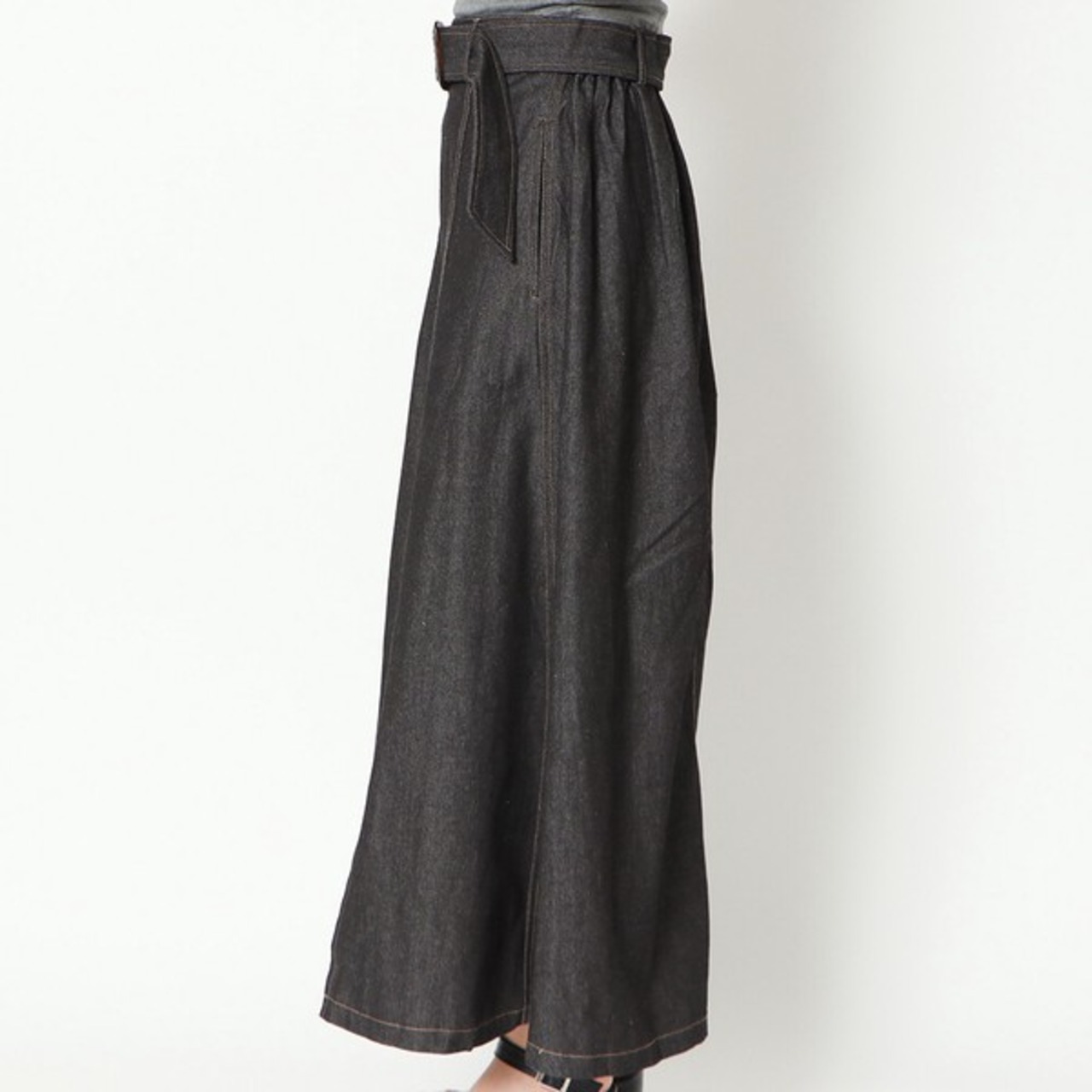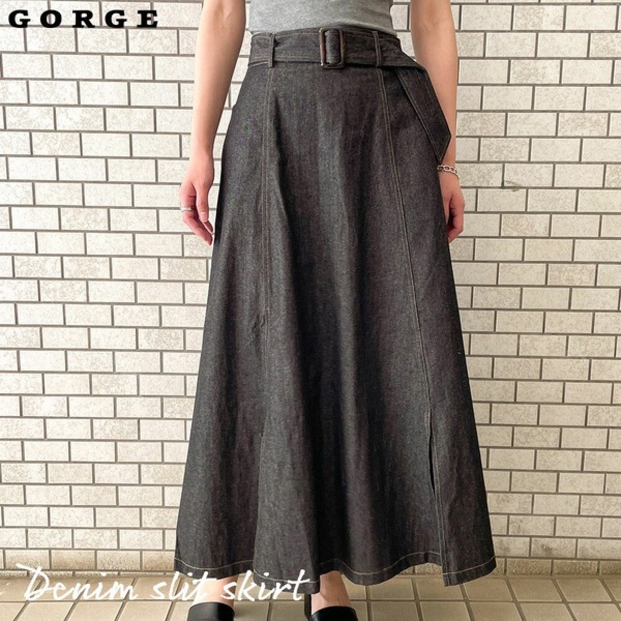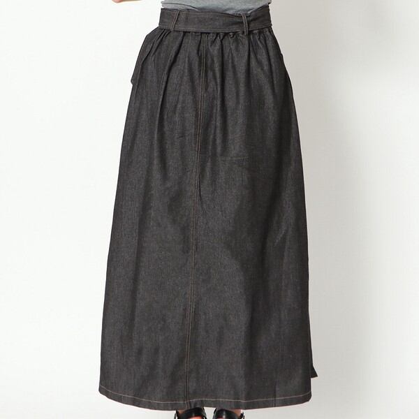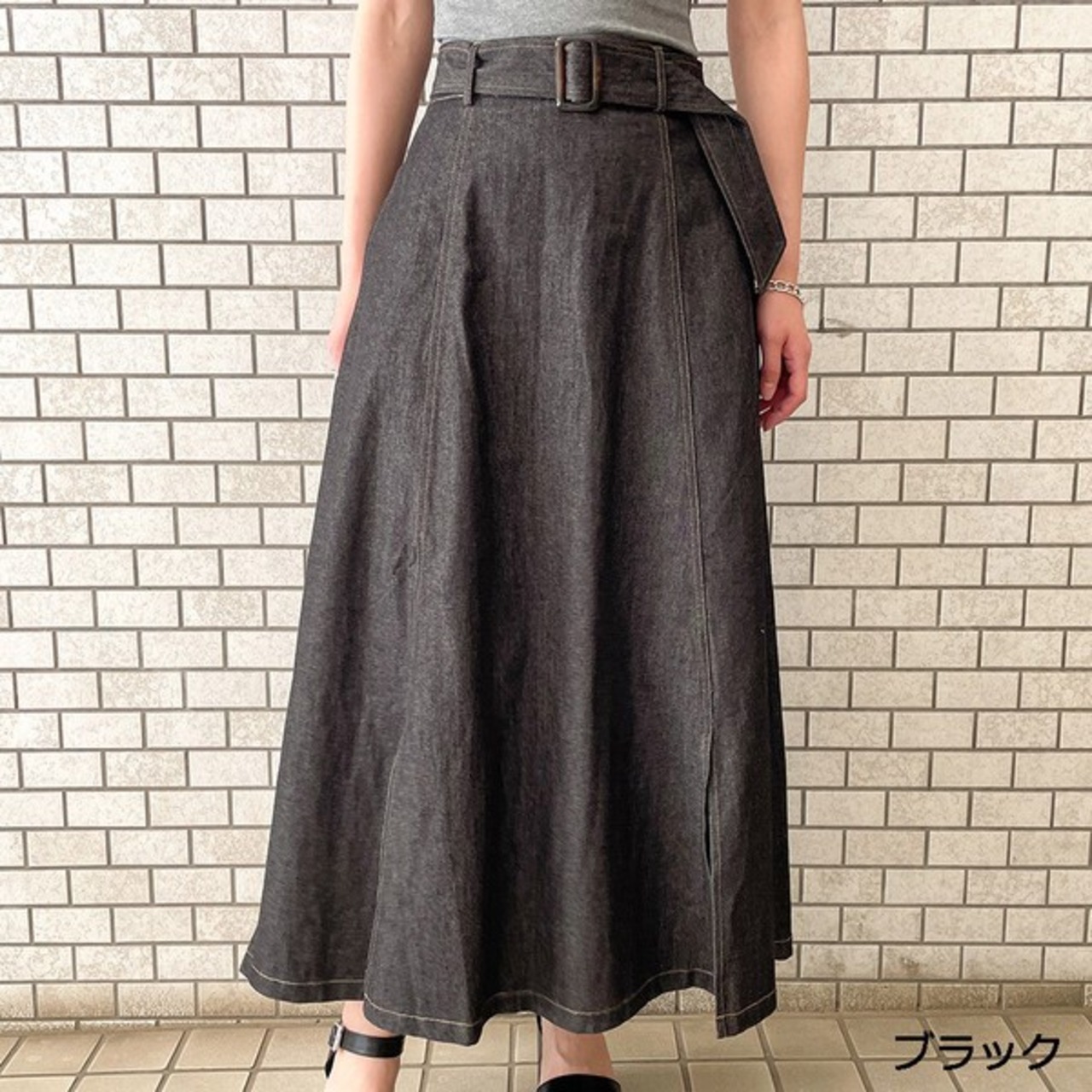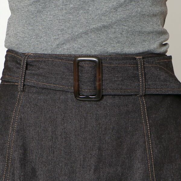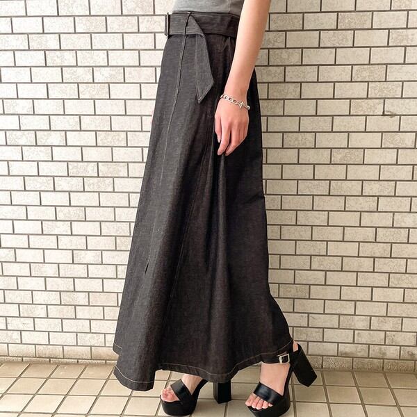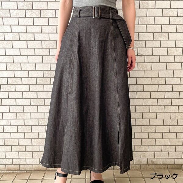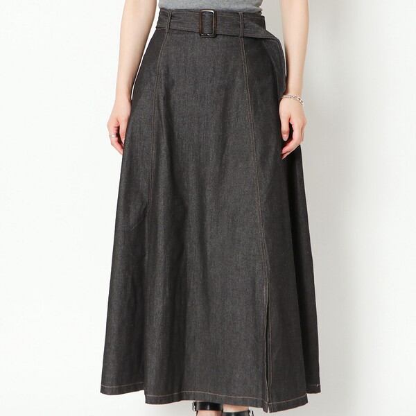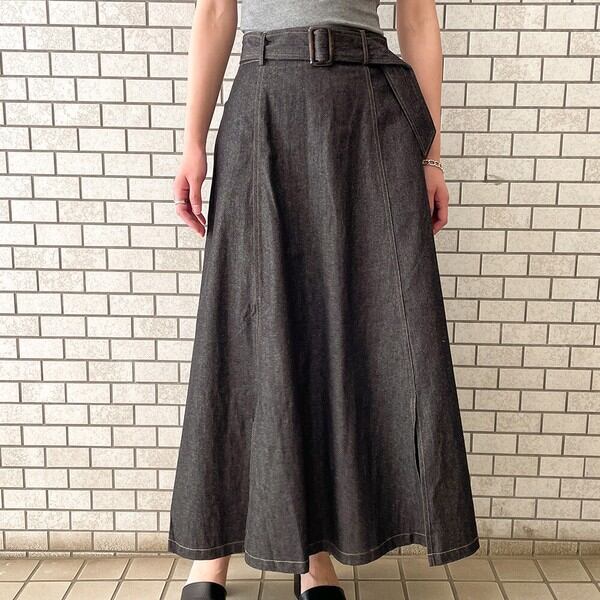 大きめバックルのベルトが存在感のあるデニムスカートの登場★たっぷりと生地を使用したフレアシルエットで女性らしいスタイルに♪スリットから覗く足元が抜け感をプラス◎シンプルなトップスを合わせるだけで華やかに決まる主役アイテム間違いなし♪デザインを活かしたウェストINのコーデがおすすめです☆