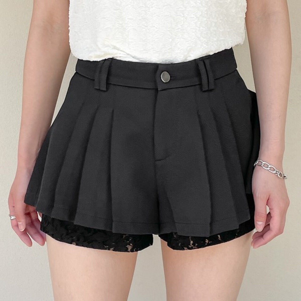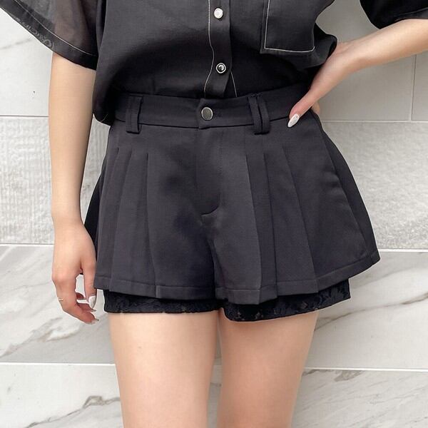 さりげない裾のインナーレースが魅力のプリーツスカパンが登場★プリーツデザインが、レッグラインをキレイに魅せて鮮度もバツグンな一枚♪裾にはレースがレイヤードされて、女の子らしさがUP◎ハイウエスト仕様で、腰の位置が高くすっきりとシェイプされて見えるのでスタイルアップ可能です☆