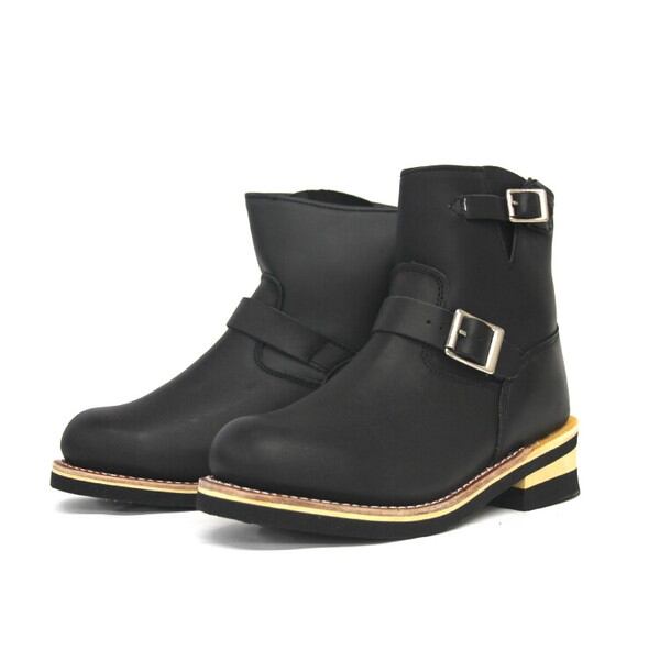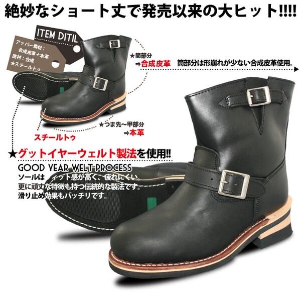 スチール(鉄板)入りトゥで本格ショートエンジニアブーツ!!素材の一部に本革使用で(筒部、踵部位は合成皮革)信頼のグッドイヤー製法です
