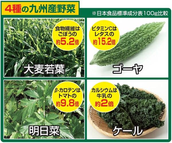●[4種の九州産野菜]大麦若葉:食物繊維はごぼうの約5.2倍、ゴーヤ:ビタミンCはレタスの約15.2倍、明日菜:β-カロテンはトマトの約9.8倍、ケール:カルシウムは牛乳の約2倍