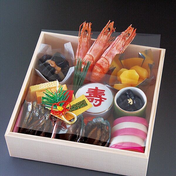☆3枚目画像:お節重イメージ →適合サイズのクリアシートを被せれば、 食品非対応のお飾りやメッセージカード等を上に置くことができます