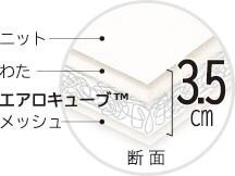 3cmのエアロキューブTMを、表はニット生地、裏はさわやかなメッシュ生地で包み込んでいます