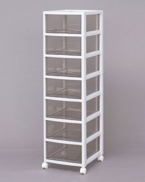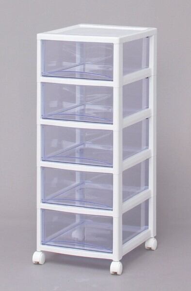 引出の材質にスチロールを採用しているため透明度が高く、中身が確認しやすいクリアタイプのチェストです