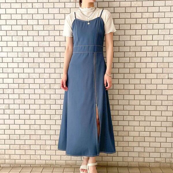 フロントのZIPスリットデザインがトレンドライクなコーディネートに仕上がるキャミワンピが登場★ワンピースに施した配色のステッチがシンプル過ぎず、引き締めた印象もプラス♪バックウェストはゴム仕様で着脱もしやすく動きやすい◎下にトップスを合わせて着るだけでなくカーディガンやシャツを上から羽織って着用するのもおすすめです☆※肩紐調整可能
