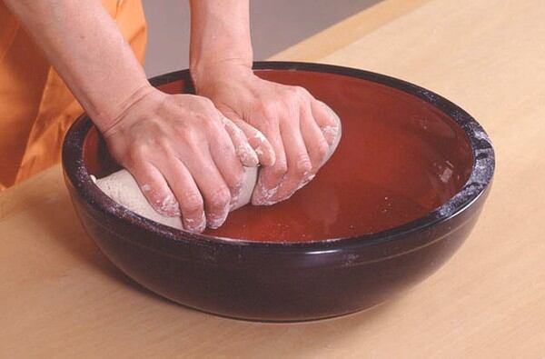 こね鉢の底の丸みをうまく使って両手でこねていきます