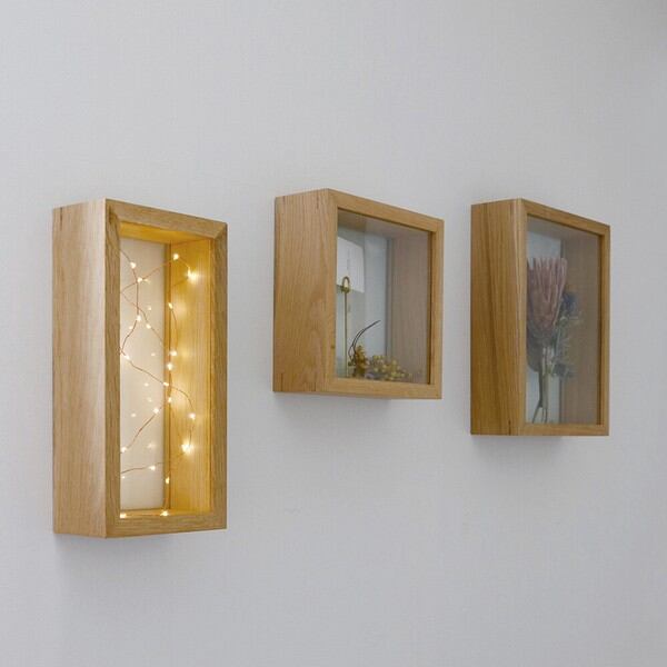照明を入れてオブジェにしたり、思い出のアイテムを飾りながら収納したり