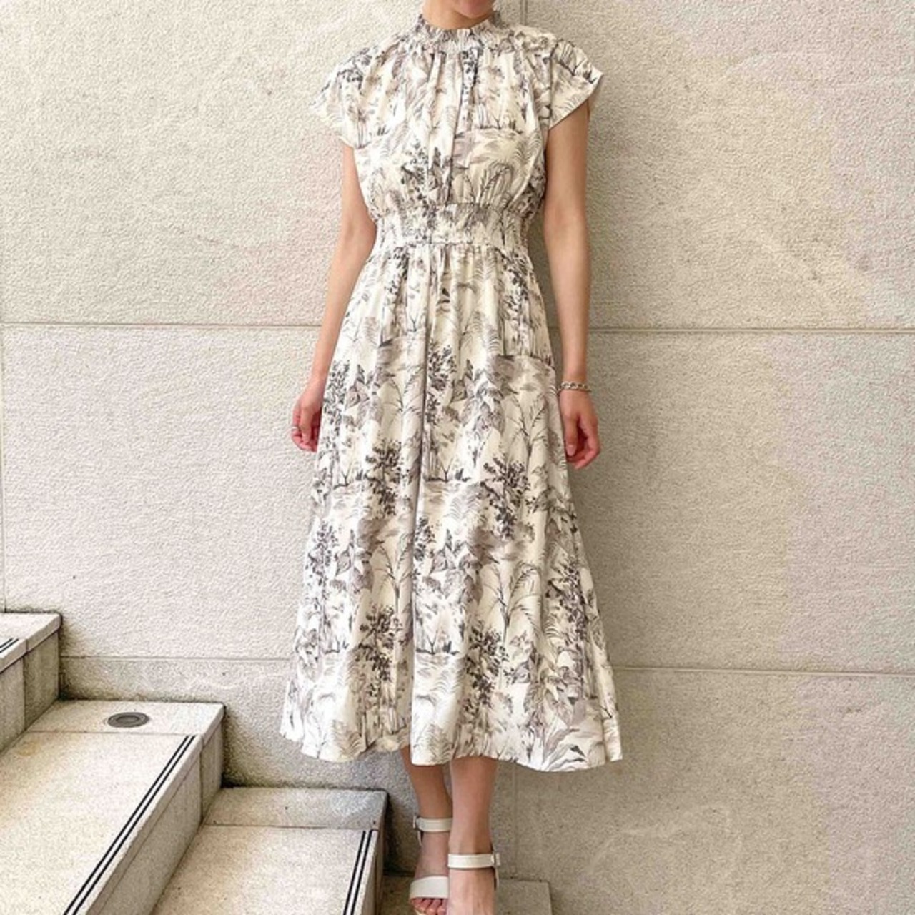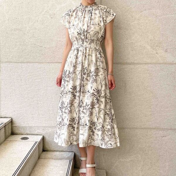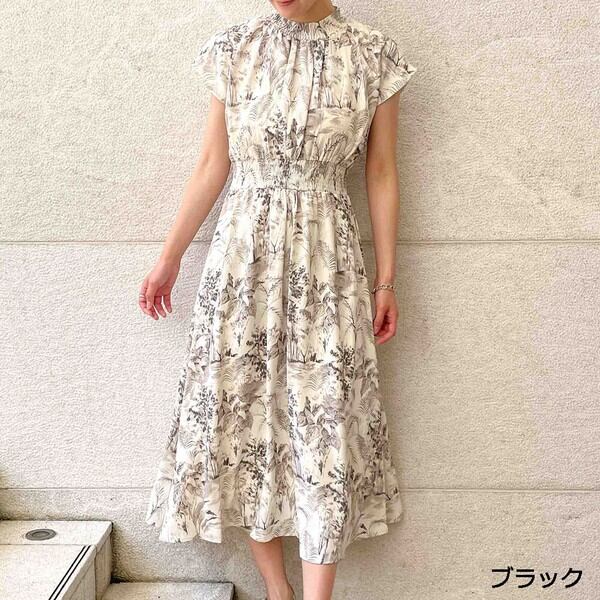 清涼感のあるデザインがシーズンライクなシャーリングワンピースが登場★プチハイネックとタックがメリハリ感をだしながら、着心地の良さもキープしたデザイン♪フレンチスリーブで気になる二の腕もほっそりみせてくれる◎ウエスト部分の幅広の切り替えシャーリングデザインがスタイルアップを叶えてくれます☆