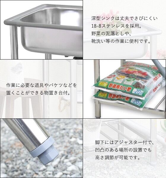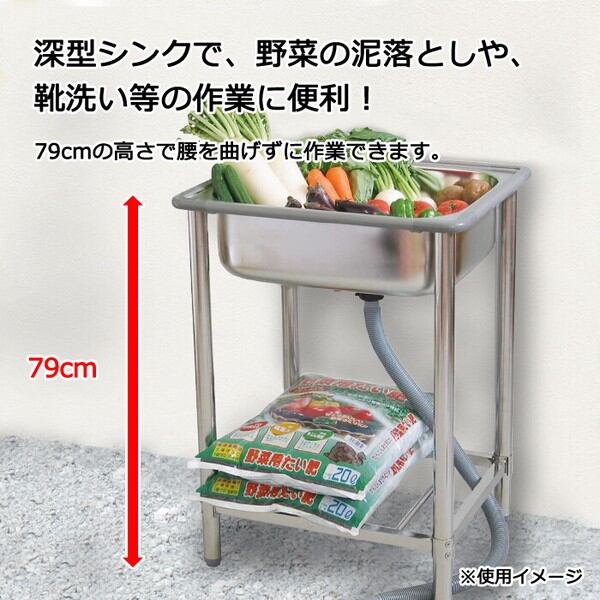 さびにくい18-8ステンレスを使用した深型シンクで、野菜の泥落としや、靴洗い等の作業オススメ