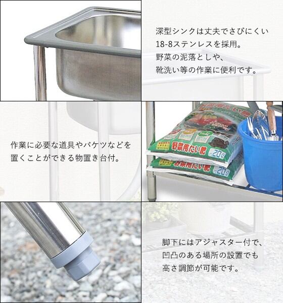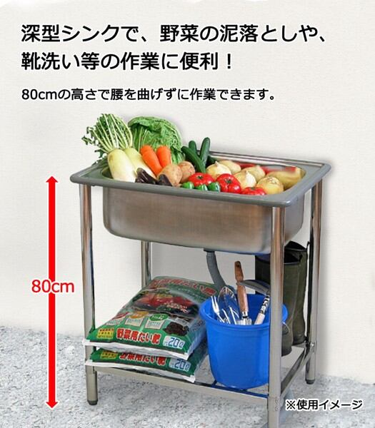 さびにくい18-8ステンレスを使用した深型シンクで、野菜の泥落としや、靴洗い等の作業オススメ