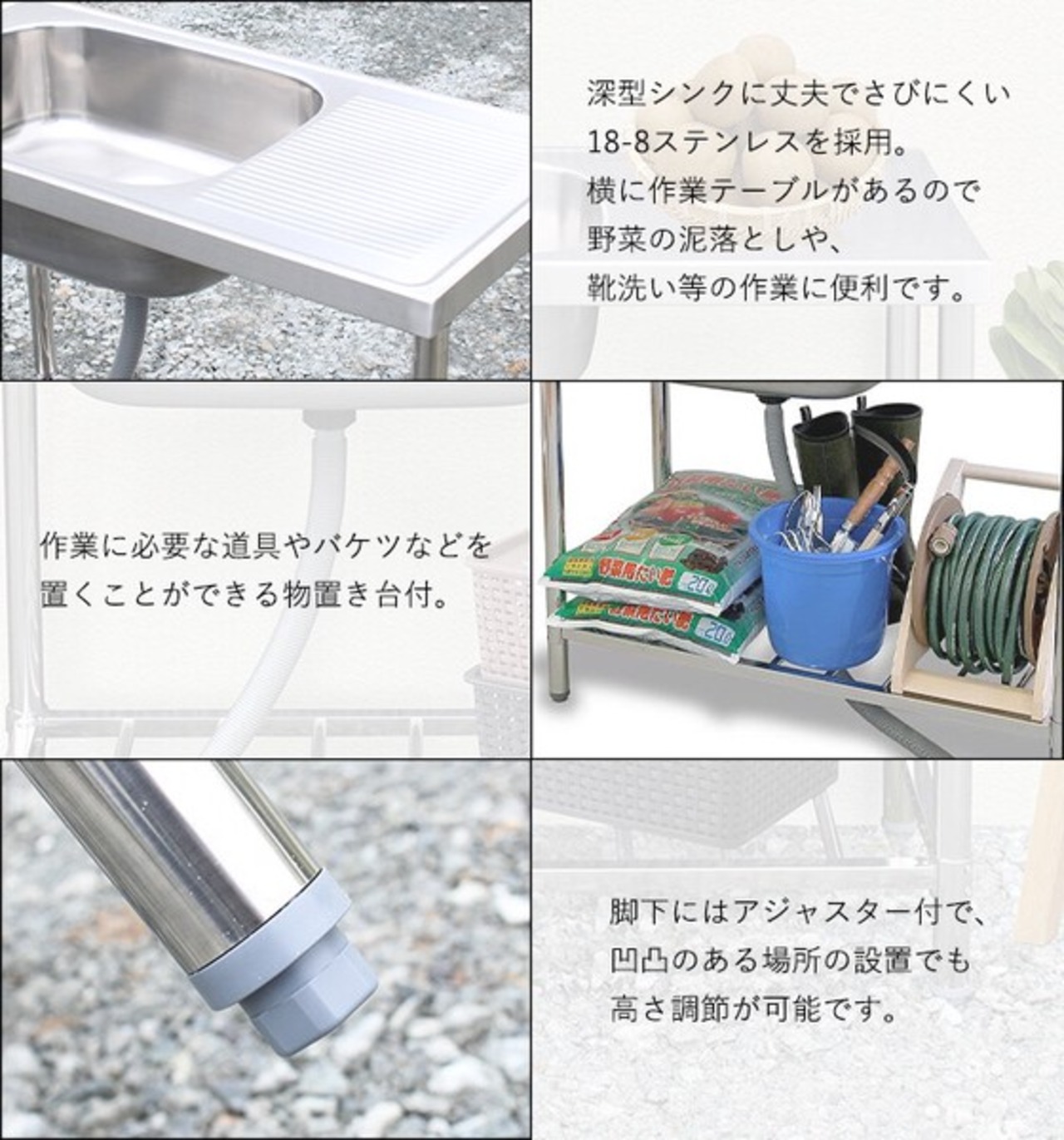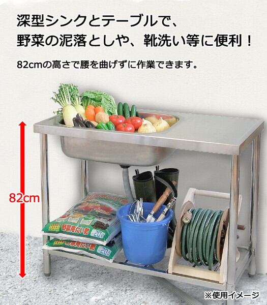 さびにくい18-8ステンレスを使用した深型シンクで、野菜の泥落としや、靴洗い等の作業オススメ
