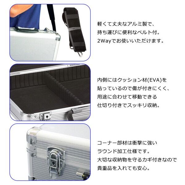 持ち運びに便利なベルト付きで、コーナー部材は衝撃に強いラウンド加工仕様となっています