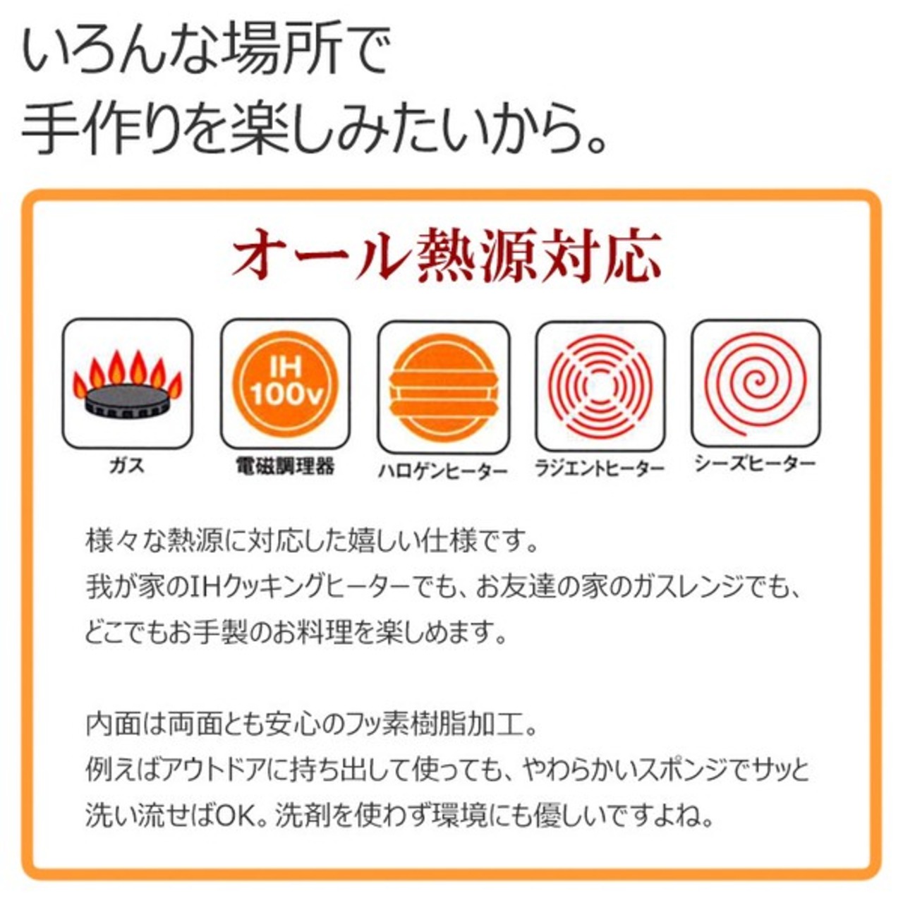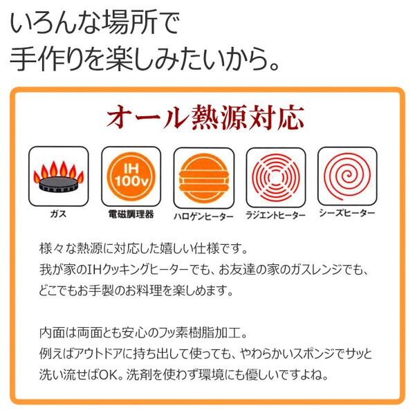使用可能熱源:ガス、IH調理100V、ハロゲンヒーター、ラジエントヒーター、シーズヒーター
