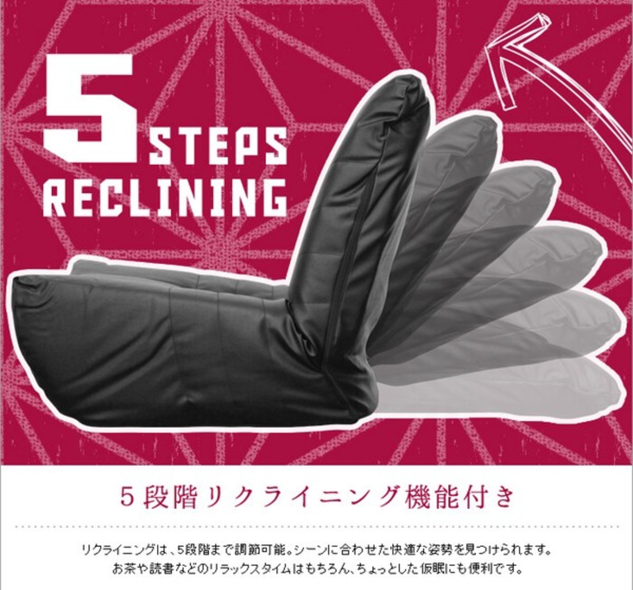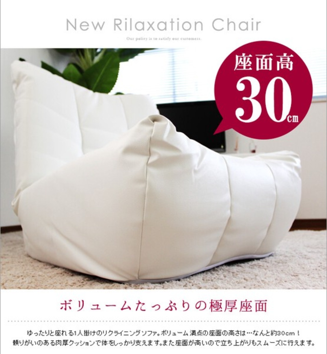 ボリューム満点の座面の高さはなんと約30cm!リクライニングは、5段階まで調節可能