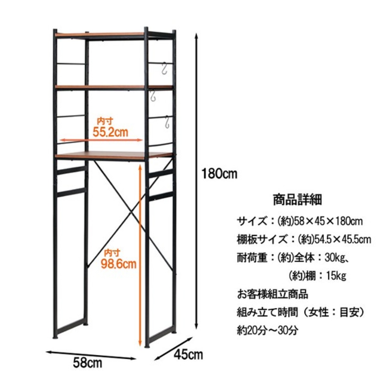 耐荷重(約):[全体]30kg、[棚]15kg
