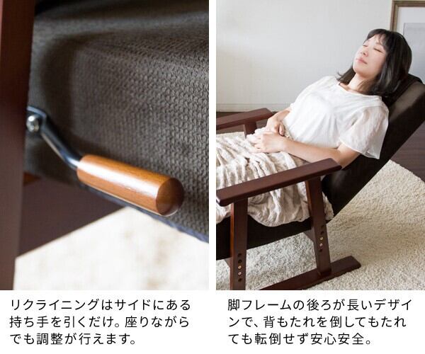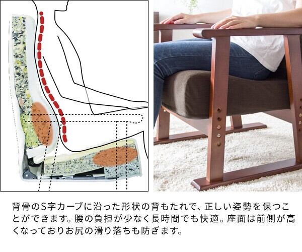丈夫な肘掛け付き天然木フレームで立ち座りもラクラク