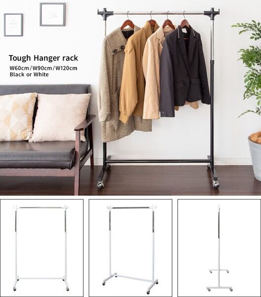 頑丈なスチール製肉厚パイプ、便利なサイドフック、ワンプッシュで100〜160cmの間で自由に高さ調節可能、移動もラクなキャスター付き、用途で選べる3サイズ!