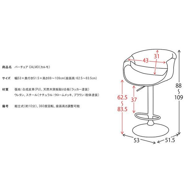 製品サイズ:幅53×奥行き51.5×高さ88〜109cm(座面高:62.5〜83.5cm)