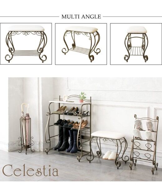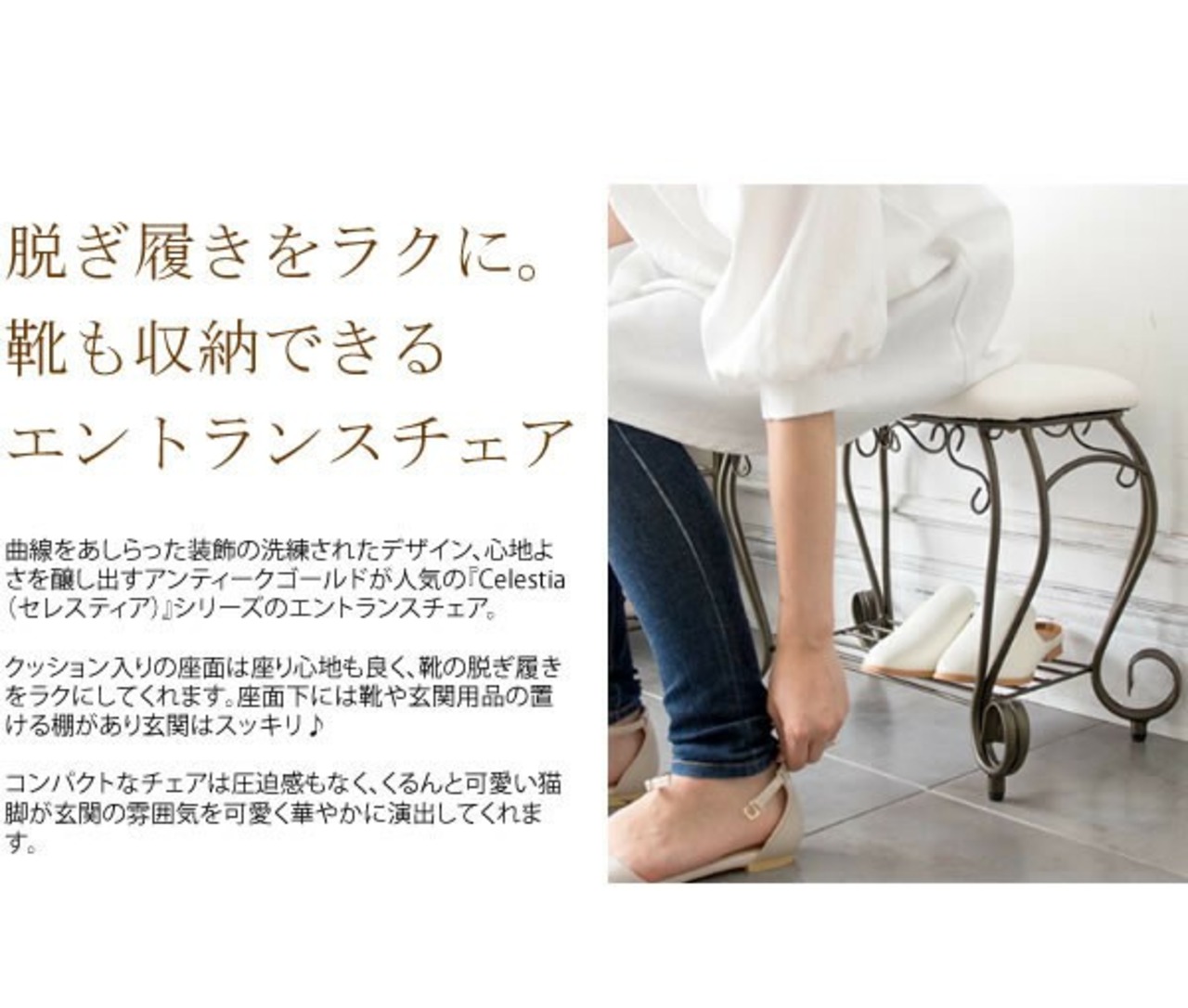 曲線をあしらった装飾の洗練されたデザイン、心地よさを醸し出すアンティークゴールドが人気の『Celestia(セレスティア)』シリーズのエントランスチェア