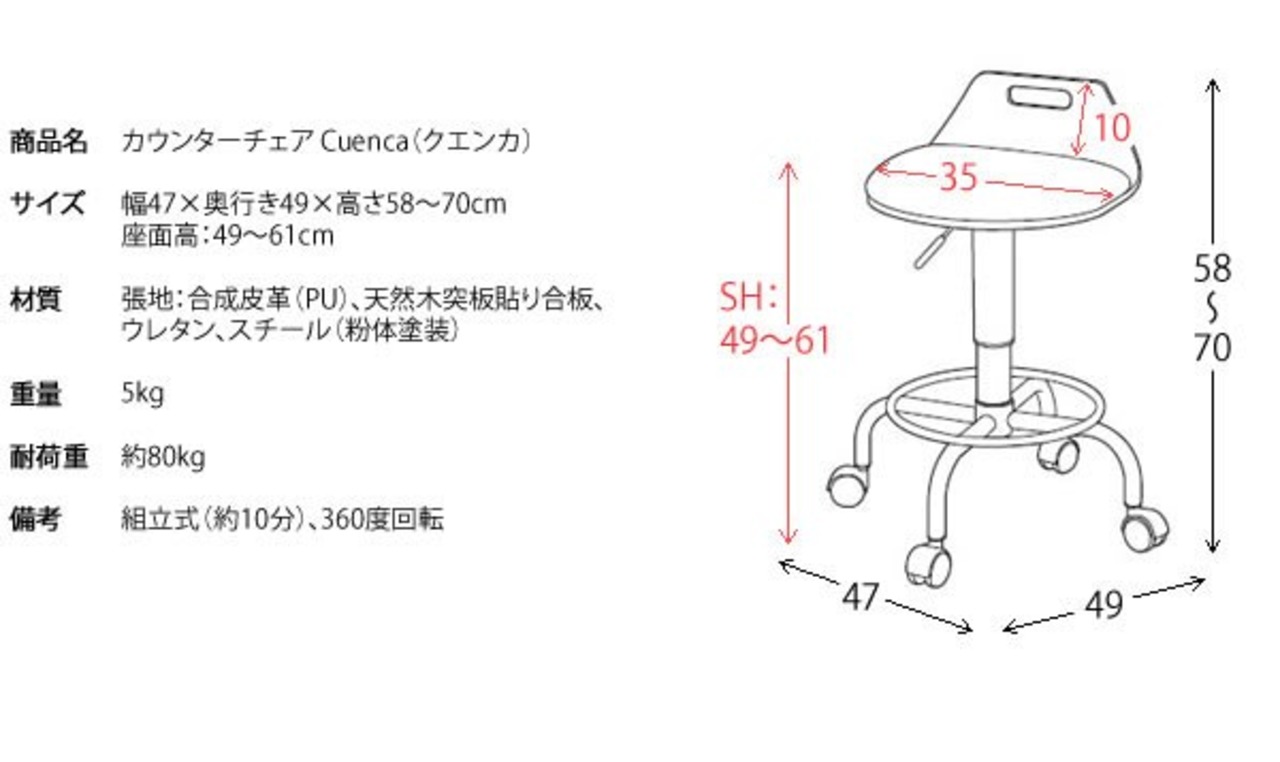 製品サイズ:約幅47×奥行49×高さ58~70cm(座面高さ約49~61cm)