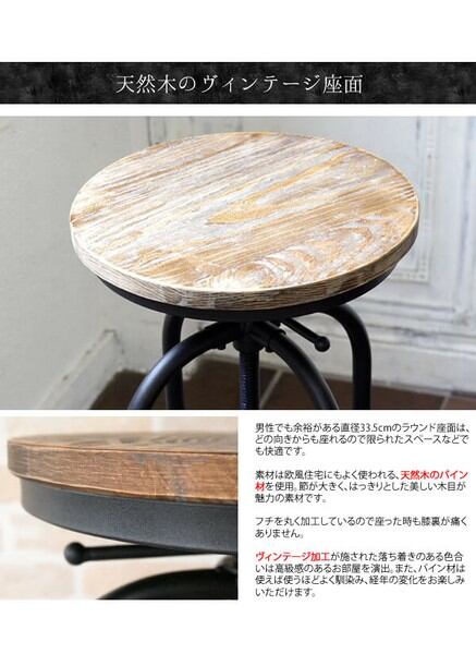 どこからでも座れるヴィンテージ加工された丸い座面と、デザインが目を引く脚フレームはインテリア性もバツグン