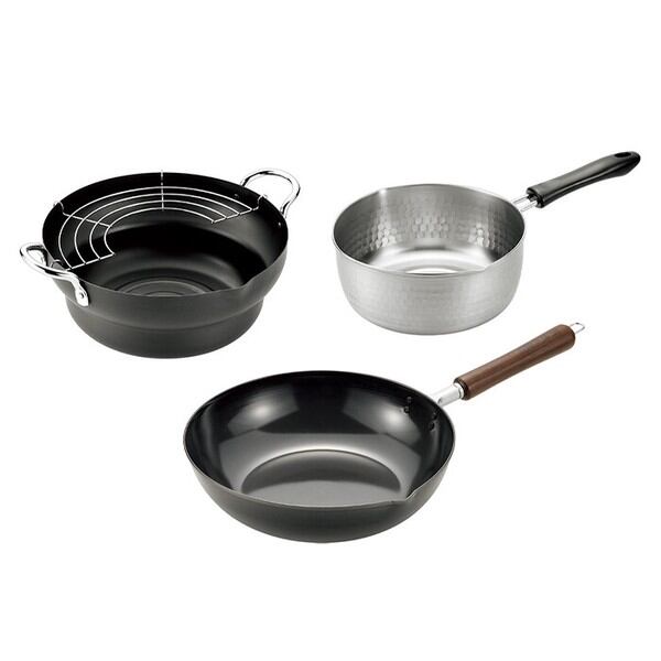 新潟県燕市産「燕熟の技」シリーズ、鉄製炒め鍋27cm・天ぷら鍋24cmと雪平鍋20cmの3点セット