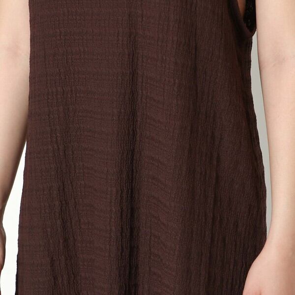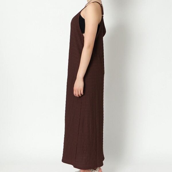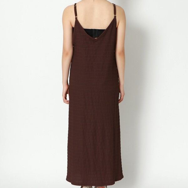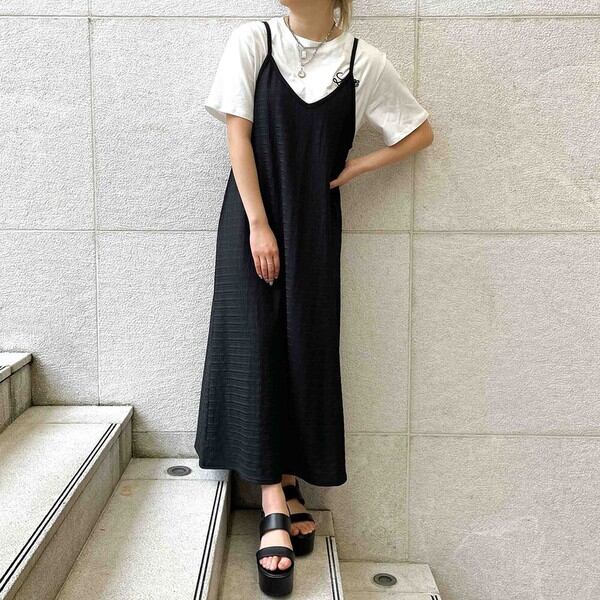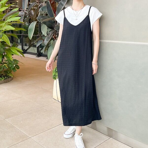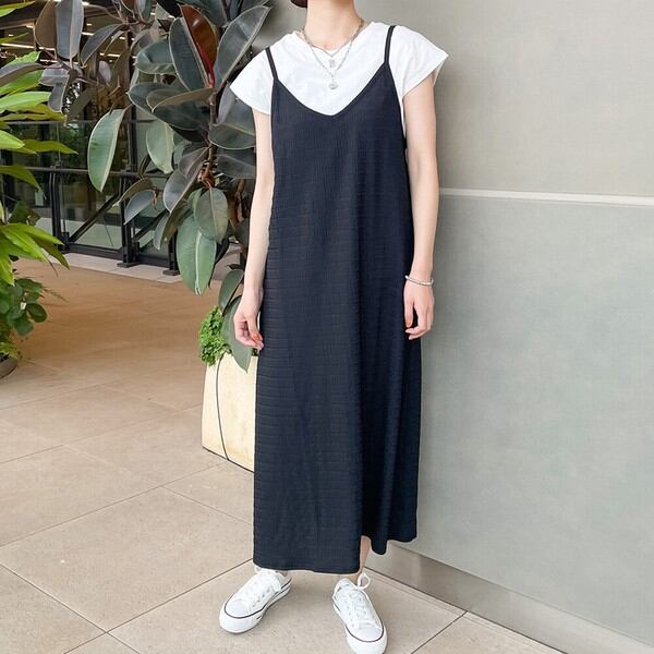 Iラインシルエットに仕上げたキャミワンピースが登場★伸縮性があり、生地に表情があるのでシンプルになりすぎない♪程よく沿いながらも身体のラインを拾い過ぎず、着るだけでスタイルアップ効果も抜群◎中にタンクトップを合わせたヘルシーな肌見せコーデがおすすめです☆