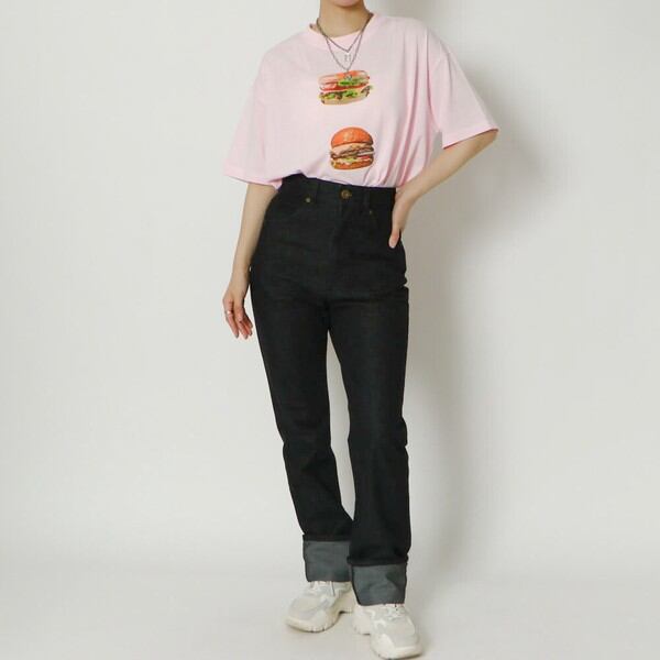 思わずかぶりつきたくなるようなハンバーガープリントが目をひくルーズTシャツが登場★ゆったりルーズなシルエットがラフでストレスフリーな着心地♪長めの袖や着丈で気になる体型もカバー◎POPなプリントはデニムはもちろん、カラーパンツやチェックパンツなどの柄物アイテムとの相性もバッチリ!レースやカラーのシアートップスをレイヤードしたスタイリングも今年らしくておすすめです☆