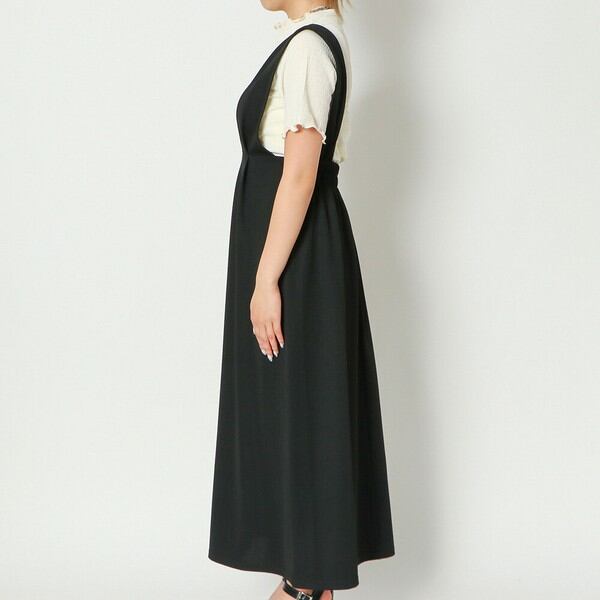 きれい見えするVネックにふんわりフレアシルエットが女性らしいシアーインナー付きジャンパースカートが登場★やや長めの丈感で大人っぽくこなしやすい一枚♪インナーにロゴTシャツなどカジュアルなアイテムでミックス感を出しても◎スタイルの主役になりながら、着回し力の高いアイテムです☆