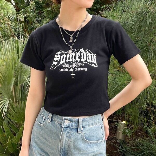 クロップド丈とフィットするコンパクトシルエットでスタイルアップが叶うTシャツが登場★フロントのシンプルながら個性的なロゴはコーディネートのポイントに♪生地に適度な厚みがあるリブ素材で肌触りが良い◎ミニスカートやショートパンツはもちろん、コンパクトなトップスなのでワイドパンツやカーゴパンツなどのゆったりとしたボリュームのあるボトムスと相性抜群です☆