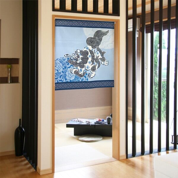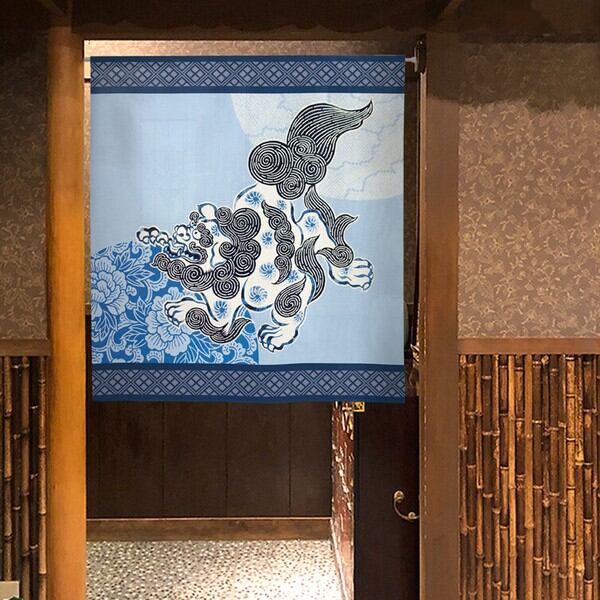 のれん 受注生産 目隠し 狛犬 青 85×丈90cm 日本製 和柄 和風 / 家具・インテリア ファブリック・敷物