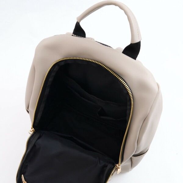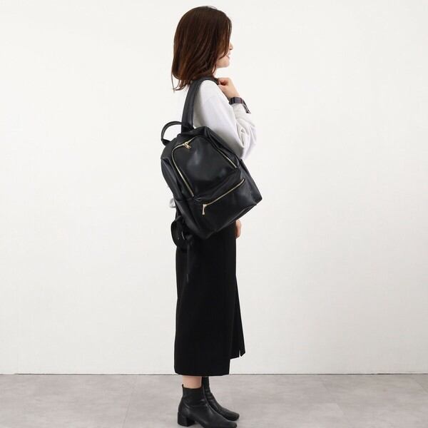 上品なオールフェイクレザーリュックサック背負った時のバックスタイルはすっきり見えながら大容量で機能満載!!前面のファスナーポケットやサイドポケットに加え、背面にも携帯がすっぽり入るオープンポケット付き!