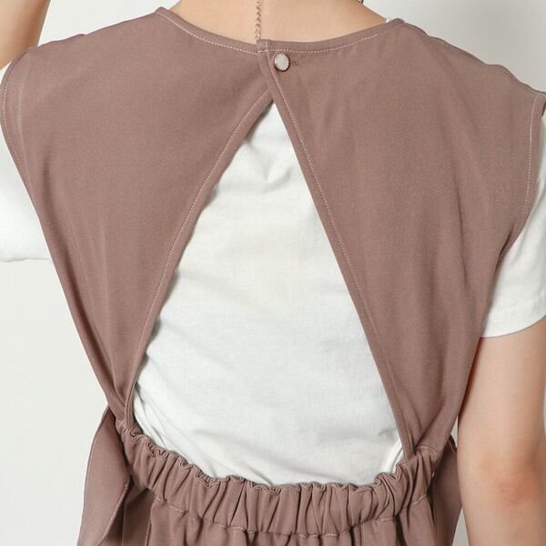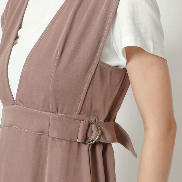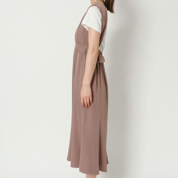 裾まわりでゆるやかに広がる、程よいマーメイドラインのジャンパースカートが登場★シンプルなシルエットながら、サイドウエストのベルトがエッジを効かせてアクセントに♪襟にはビジューライクなボタンを配置したバックスタイルまでこだわった一枚◎キレイめな素材感ながらバックゴム入りなのでオフィスシーンはもちろん旅行などにもオススメです☆
