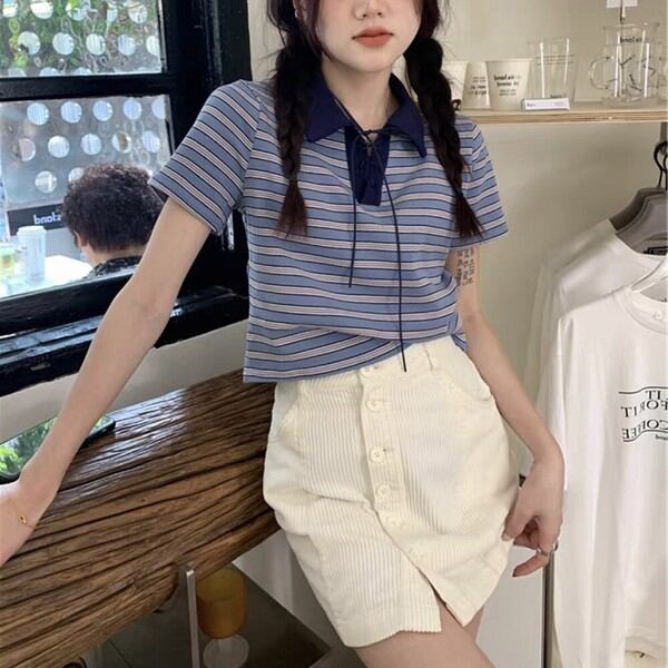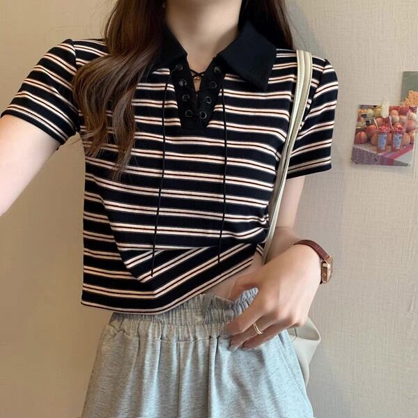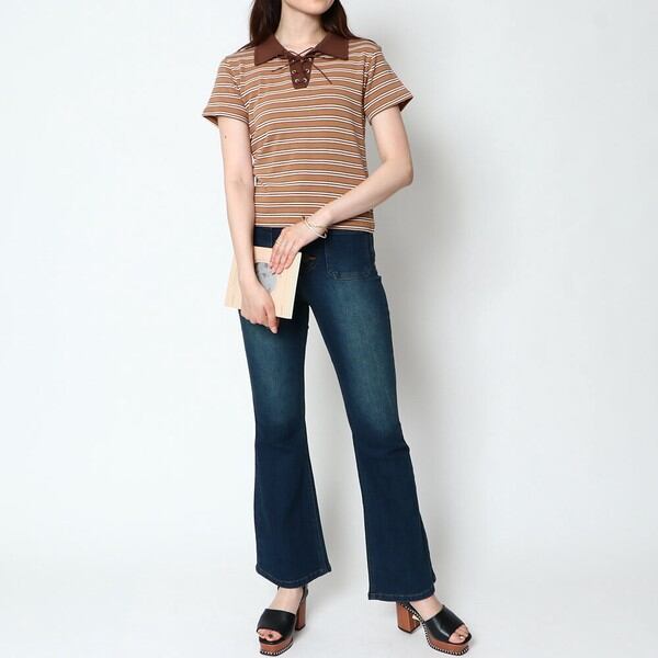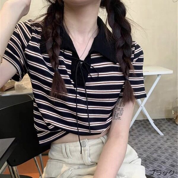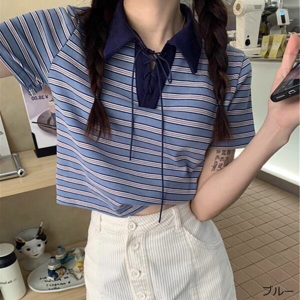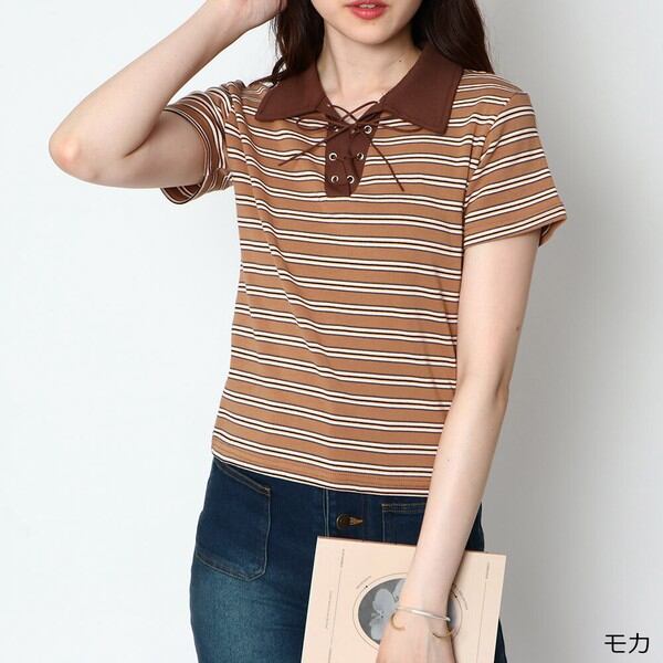 胸元のデザインが靴紐のように交差してオシャレな雰囲気のスピンドルスキッパートップスが登場★キュートなボーダー配色デザインで可愛らしいルックスのアイテム♪海外のカフェにいる女性を彷彿とさせるカジュアルな色合いです◎