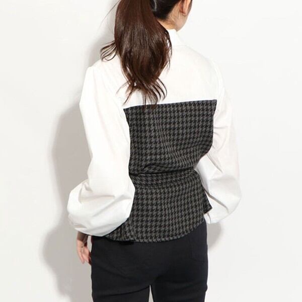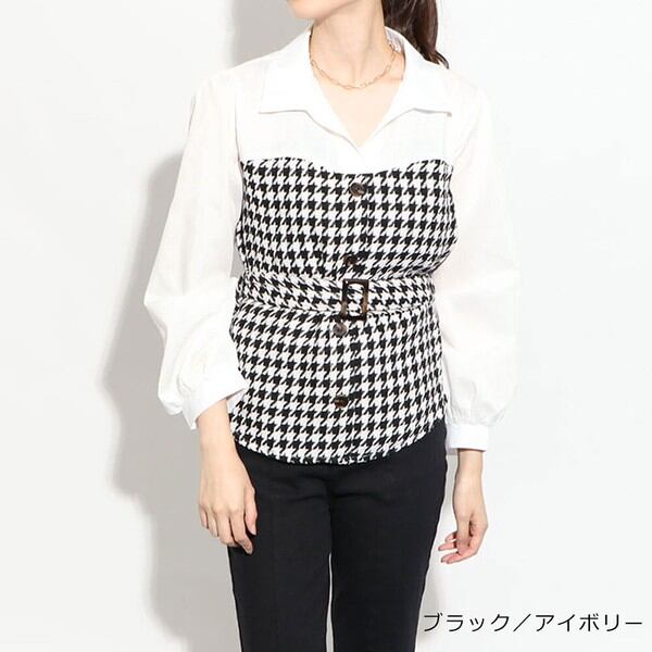 きちんと感のあるシャツブラウスに千鳥柄の異素材ドッキングがCUTE☆ウエストマークになるベルト付きでスタイルアップ効果もバツグン◎デザイン性のあるトップスなのでデニムなどシンプルなボトムに合わせるだけでオシャレ☆