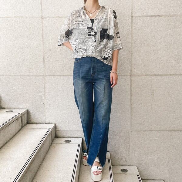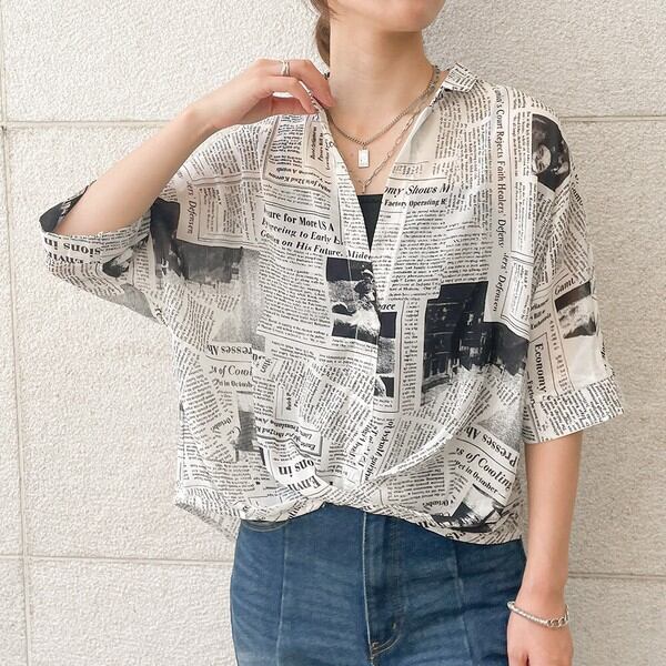 シーズンライクなシアー感のあるインナー付きシャツが登場★どんなアイテムにも合わせやすい無地とインパクトのあるニュースペーパー柄が新鮮な1着♪前後差のあるラウンド裾にタックでこなれ感をプラス◎パンツスタイルでクールにきめたり、スカートで女性らしさをプラスしても可愛いアイテムです☆