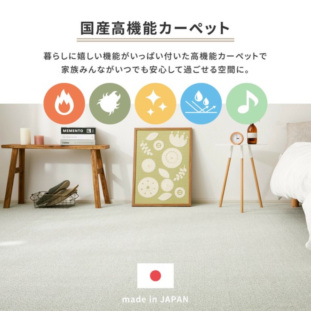 防ダニ・抗菌・撥水・防汚の多機能付き国産カーペット