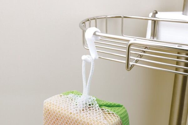 ●ワイヤー仕様で水はけが良く衛生的で調節可能なかご、タオルやスポンジを掛けるのに便利なフック、石鹸等を置くのに便利な小物置きマット付きです