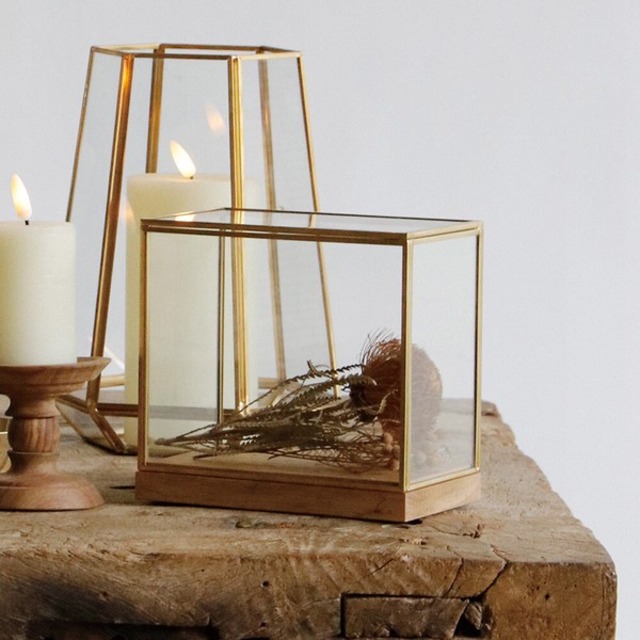 今あるインテリアに馴染みやすいオークウッドをベースに、ブラスフレームで出来たガラスのディスプレイボックスです